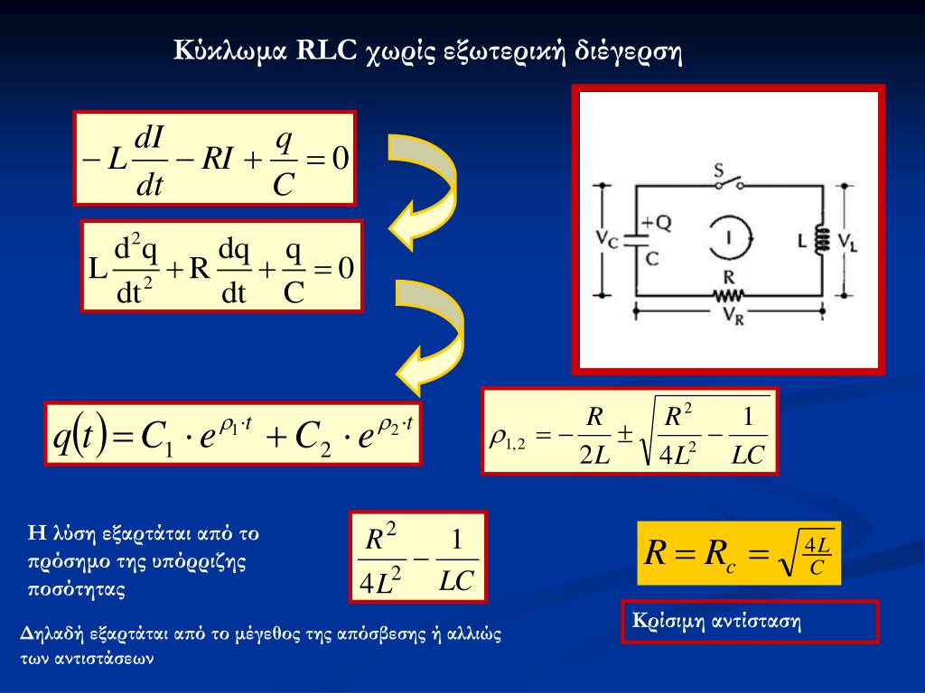 Κύκλωμα RLC χωρίς εξωτερική διέγερση Η λύση εξαρτάται από το πρόσημο της υπόρριζης ποσότητας Κρίσιμη αντίσταση Δηλαδή εξαρτάται από το μέγεθος της απόσβεσης ή αλλιώς των αντιστάσεων