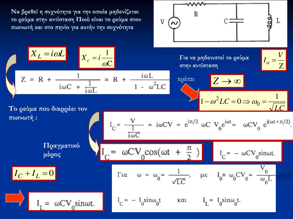Να βρεθεί η συχνότητα για την οποία μηδενίζεται το ρεύμα στην αντίσταση Ποιό είναι το ρεύμα στον πυκνωτή και στο πηνίο για αυτήν την συχνότητα Για να μηδενιστεί το ρεύμα στην αντίσταση πρέπει Το ρεύμα που διαρρέει τον πυκνωτή : Πραγματικό μέρος