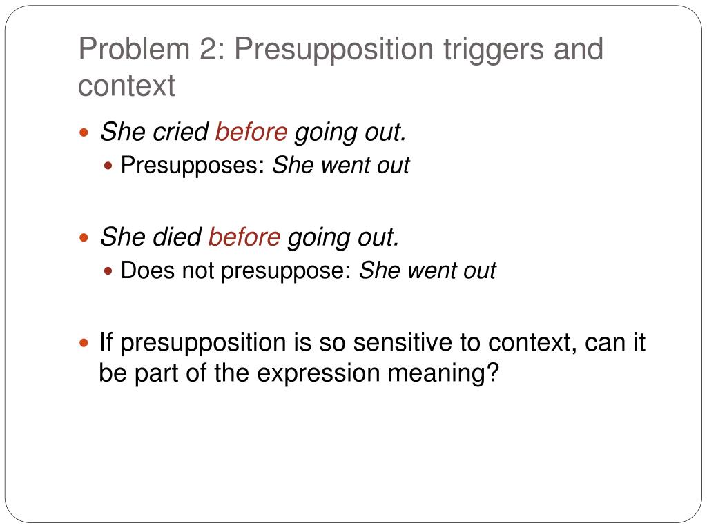 Problem 2: Presupposition triggers and context • She cried before going out. • Presupposes:She went out • She died before going out. • Does not presuppose: She went out • If presupposition is so sensitive to context, can it be part of the expression meaning?