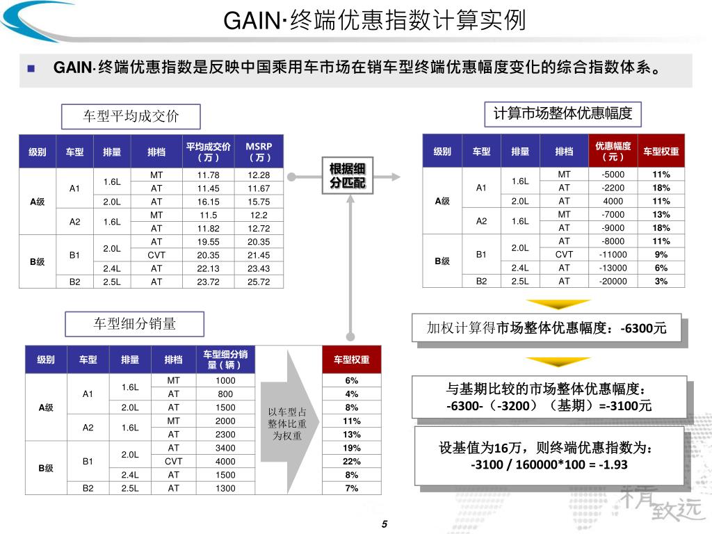 GAIN·终端优惠指数计算实例 • GAIN·终端优惠指数是反映中国乘用车市场在销车型终端优惠幅度变化的综合指数体系。 计算市场整体优惠幅度 车型平均成交价 根据细分匹配 车型细分销量 加权计算得市场整体优惠幅度:-6300元 与基期比较的市场整体优惠幅度: -6300-(-3200)(基期)=-3100元 以车型占整体比重为权重 设基值为16万,则终端优惠指数为: -3100 / 160000*100 = -1.93