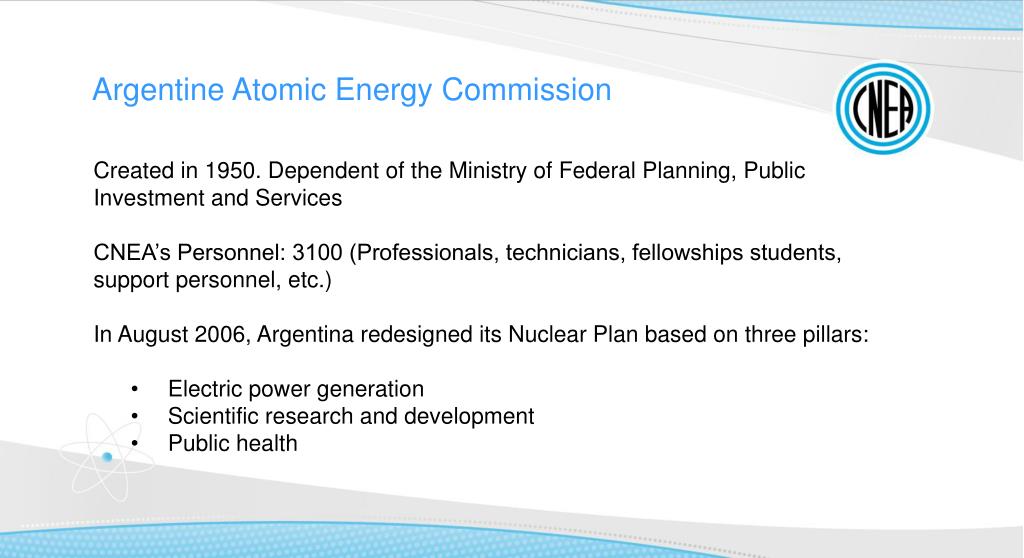 ArgentineAtomicEnergyCommission • Created in 1950. Dependent of the Ministry of Federal Planning, Public Investment and Services • CNEA’s Personnel: 3100 (Professionals, technicians, fellowships students, support personnel, etc.) • In August 2006, Argentina redesigned its Nuclear Plan based on three pillars: • Electric power generation • Scientific research and development • Public health