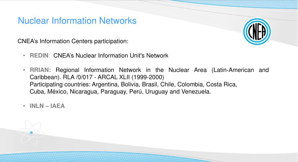 Nuclear Information Networks • CNEA’s Information Centers participation: • REDIN: CNEA’s Nuclear Information Unit's Network • RRIAN:Regional Information Network in the Nuclear Area (Latin-American and Caribbean). RLA /0/017 - ARCAL XLII (1999-2000) • Participating countries: Argentina, Bolivia, Brasil, Chile, Colombia, Costa Rica, • Cuba, México, Nicaragua, Paraguay, Perú, Uruguay and Venezuela. • INLN – IAEA