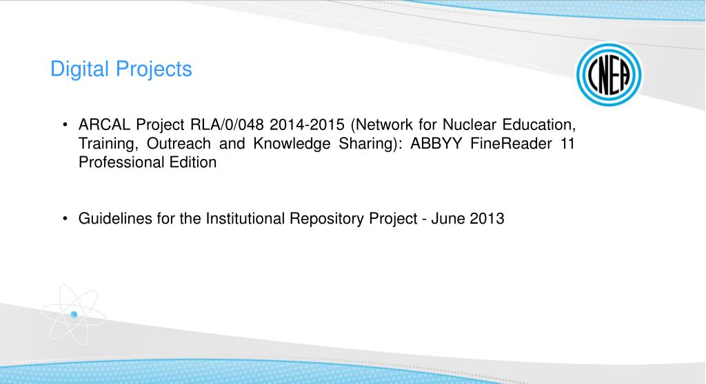 Digital Projects • ARCAL Project RLA/0/048 2014-2015 (Network for Nuclear Education, Training, Outreach and Knowledge Sharing): ABBYY FineReader 11 Professional Edition • Guidelines for the Institutional Repository Project - June 2013
