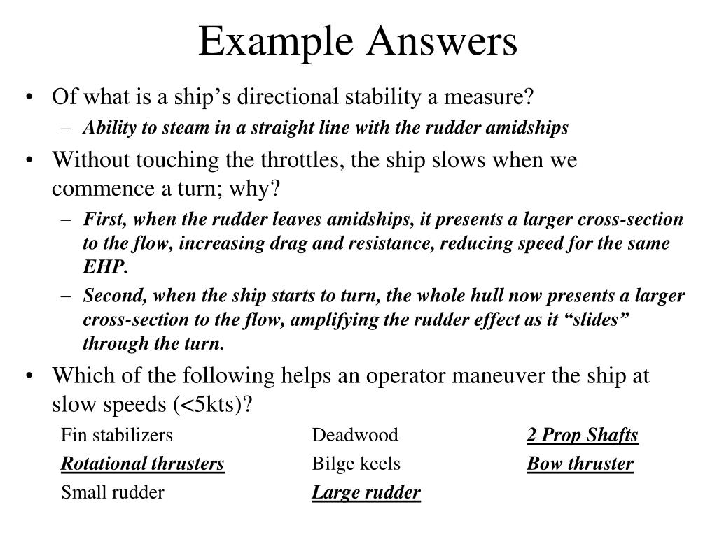 Example Answers • Of what is a ship’s directional stability a measure? • Ability to steam in a straight line with the rudder amidships • Without touching the throttles, the ship slows when we commence a turn; why? • First, when the rudder leaves amidships, it presents a larger cross-section to the flow, increasing drag and resistance, reducing speed for the same EHP. • Second, when the ship starts to turn, the whole hull now presents a larger cross-section to the flow, amplifying the rudder effect as it “slides” through the turn. • Which of the following helps an operator maneuver the ship at slow speeds (<5kts)? Fin stabilizers Deadwood 2 Prop Shafts Rotational thrusters Bilge keels Bow thruster Small rudder Large rudder