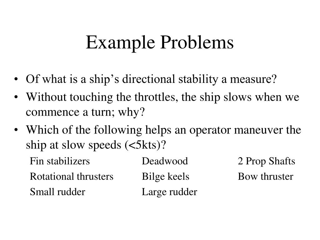 Example Problems • Of what is a ship’s directional stability a measure? • Without touching the throttles, the ship slows when we commence a turn; why? • Which of the following helps an operator maneuver the ship at slow speeds (<5kts)? Fin stabilizers Deadwood 2 Prop Shafts Rotational thrusters Bilge keels Bow thruster Small rudder Large rudder