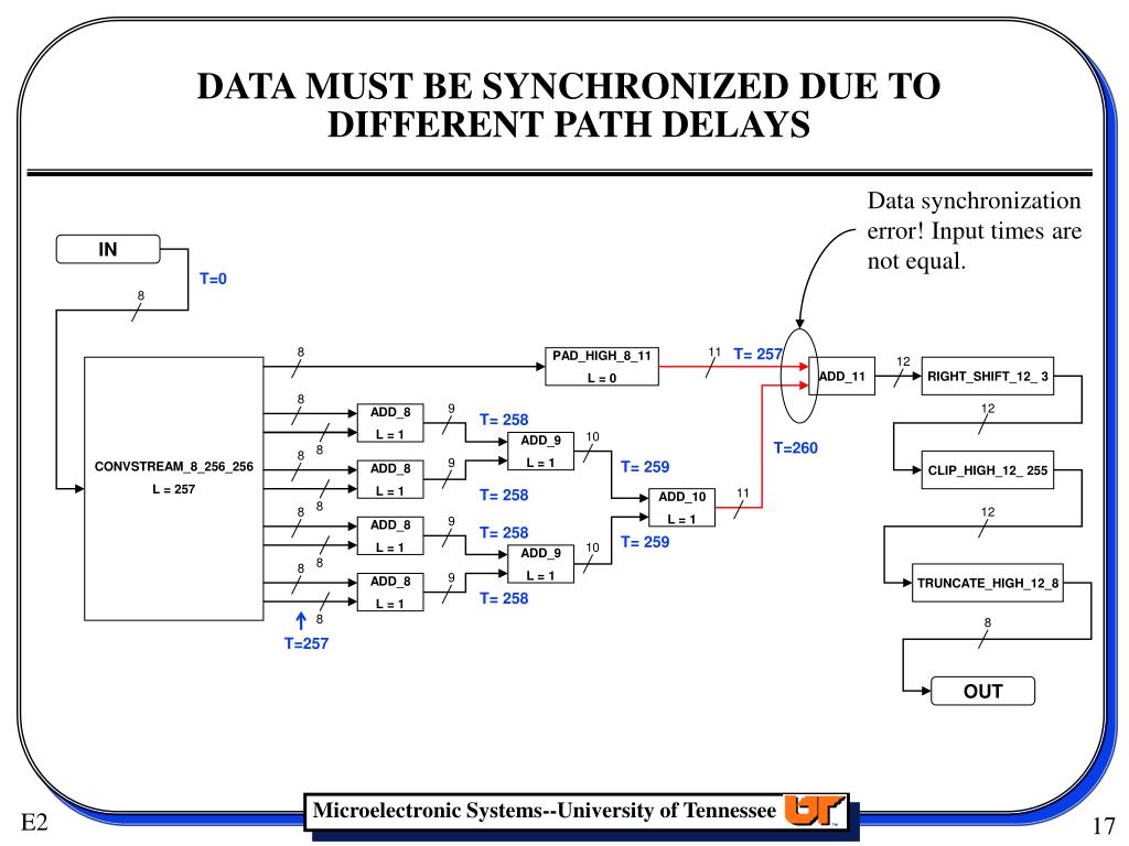 9 9 12 12 10 10 9 11 9 8 8 8 8 8 8 8 8 8 8 DATA MUST BE SYNCHRONIZED DUE TO DIFFERENT PATH DELAYS Data synchronization error! Input times are not equal. IN T=0 11 T= 257 PAD_HIGH_8_11 L = 0 CONVSTREAM_8_256_256 L = 257 ADD_11 RIGHT_SHIFT_12_ 3 12 ADD_8 L = 1 T= 258 ADD_9 L = 1 T=260 T= 259 CLIP_HIGH_12_ 255 ADD_8 L = 1 T= 258 ADD_10 L = 1 ADD_8 L = 1 T= 258 T= 259 ADD_9 L = 1 TRUNCATE_HIGH_12_8 ADD_8 L = 1 T= 258 8 T=257 OUT