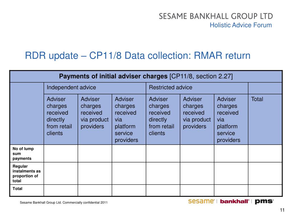 RDR update – CP11/8 Data collection: RMAR return FSA expects that advisers that structure their charges based on the type of advice service (rather than on an hourly or percentage of investment basis) would be able to work out what this charge is on an hourly basis. 12