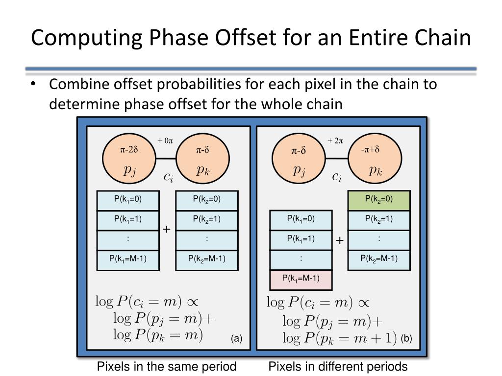 Computing Phase Offset for an Entire Chain • Combine offset probabilities for each pixel in the chain to determine phase offset for the whole chain + 0π + 2π π-δ -π+δ π-2δ π-δ (a) (b) P(k2=0) P(k1=0) P(k2=0) P(k1=0) P(k2=1) P(k1=1) P(k2=1) + + : P(k1=1) : : Pixels in the same period Pixels in different periods : P(k2=M-1) P(k1=M-1) P(k2=M-1) P(k1=M-1) (a) (b)