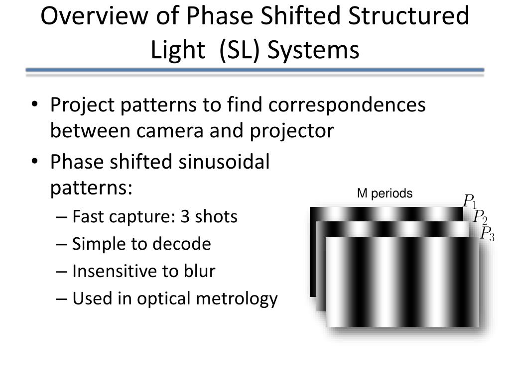 Overview of Phase Shifted StructuredLight (SL) Systems • Project patterns to find correspondences between camera and projector • Phase shifted sinusoidal patterns: • Fast capture: 3 shots • Simple to decode • Insensitive to blur • Used in optical metrology M periods