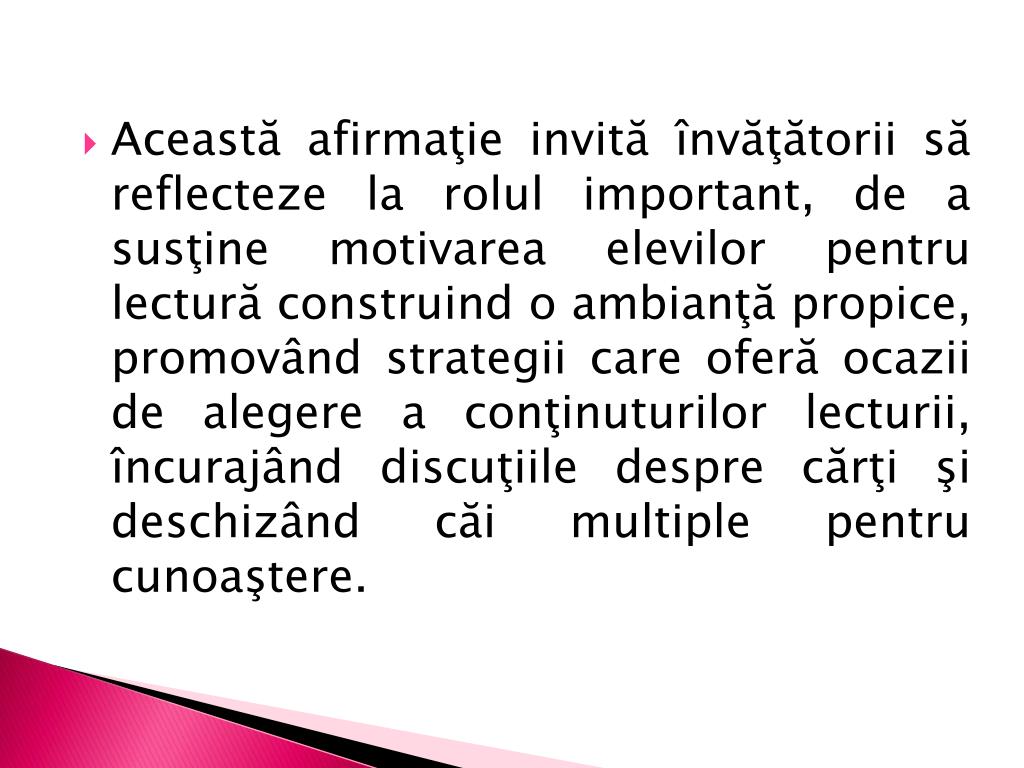 Această afirmaţie invită învăţătorii să reflecteze la rolul important, de a susţine motivarea elevilor pentru lectură construind o ambianţă propice, promovând strategii care oferă ocazii de alegere a conţinuturilor lecturii, încurajând discuţiile despre cărţi şi deschizând căi multiple pentru cunoaştere.