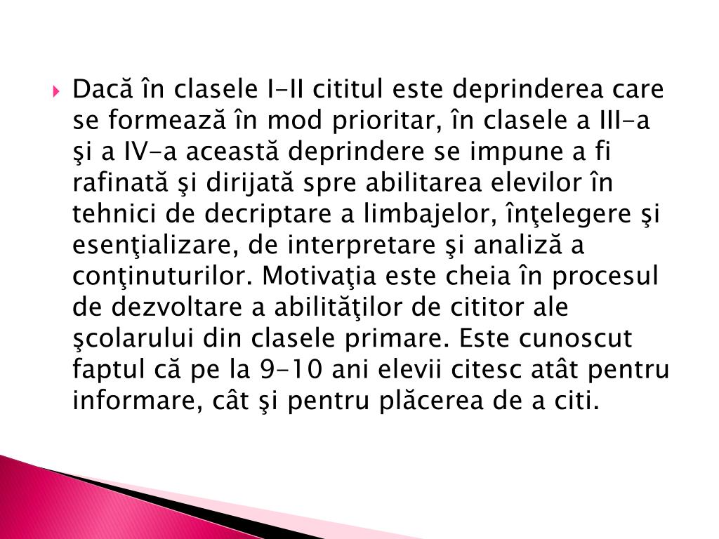 Dacă în clasele I-II cititul este deprinderea care se formează în mod prioritar, în clasele a III-a şi a IV-a această deprindere se impune a fi rafinată şi dirijată spre abilitarea elevilor în tehnici de decriptare a limbajelor, înţelegere şi esenţializare, de interpretare şi analiză a conţinuturilor. Motivaţia este cheia în procesul de dezvoltare a abilităţilor de cititor ale şcolarului din clasele primare. Este cunoscut faptul că pe la 9-10 ani elevii citesc atât pentru informare, cât şi pentru plăcerea de a citi.