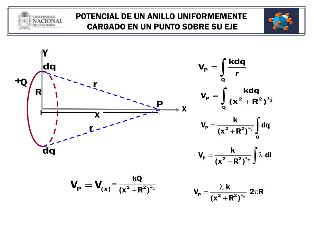 Y Q X x POTENCIAL DE UN ANILLO UNIFORMEMENTE CARGADO EN UN PUNTO SOBRE SU EJE dl 2pR