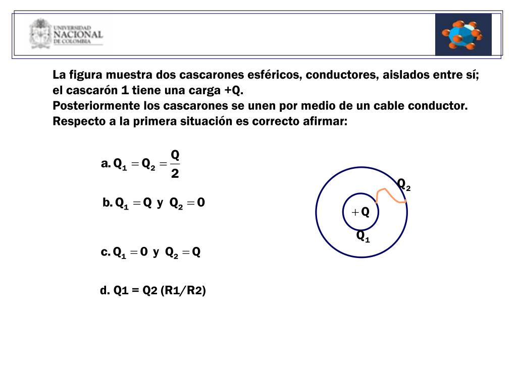 La figura muestra dos cascarones esféricos, conductores, aislados entre sí; el cascarón 1 tiene una carga +Q. Posteriormente los cascarones se unen por medio de un cable conductor. Es correcto afirmar: d. No se puede conocer