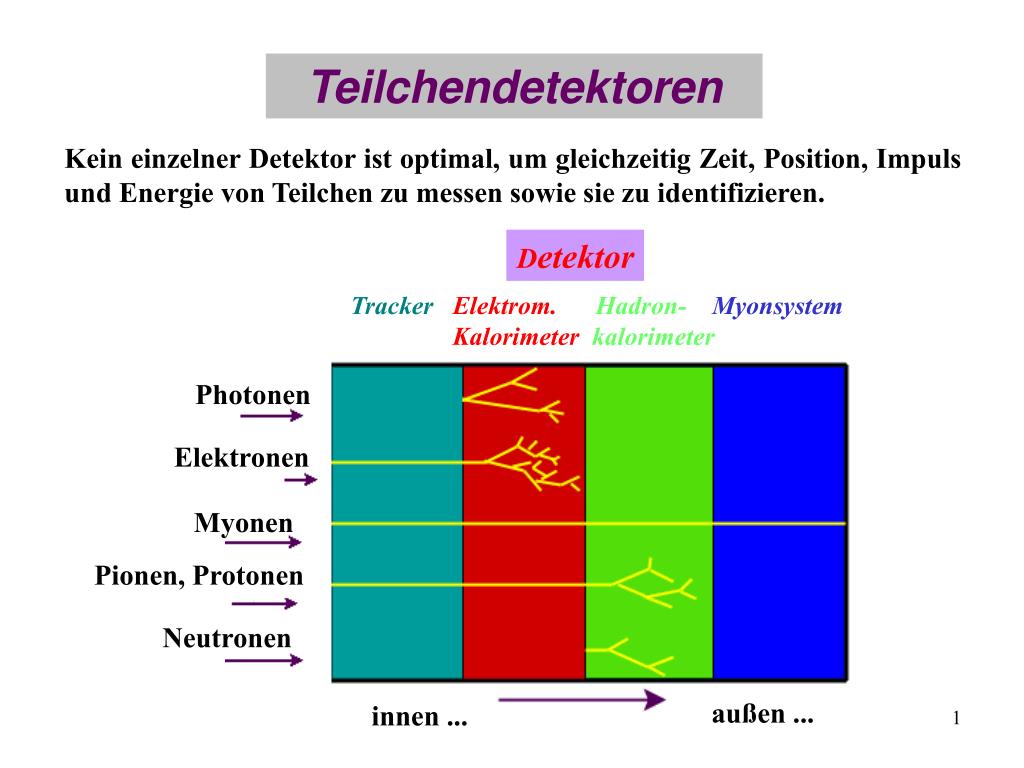 Photonen Elektronen Myonen Pionen, Protonen Neutronen außen ... innen ... Teilchendetektoren Kein einzelner Detektor ist optimal, um gleichzeitig Zeit, Position, Impuls und Energie von Teilchen zu messen sowie sie zu identifizieren. Detektor TrackerElektrom.Hadron-Myonsystem Kalorimeterkalorimeter