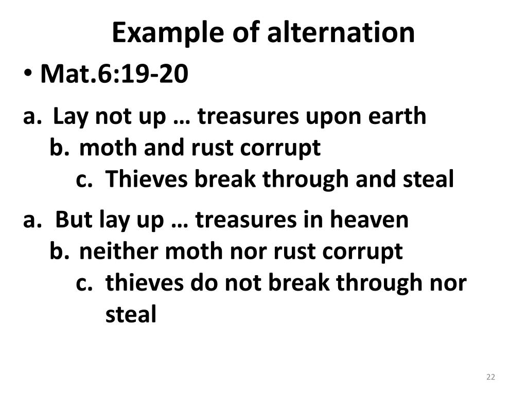 Example of alternation Mat.6:19-20 Lay not up … treasures upon earth moth and rust corrupt Thieves break through and steal a. But lay up … treasures in heaven neither moth nor rust corrupt thieves do not break through nor steal