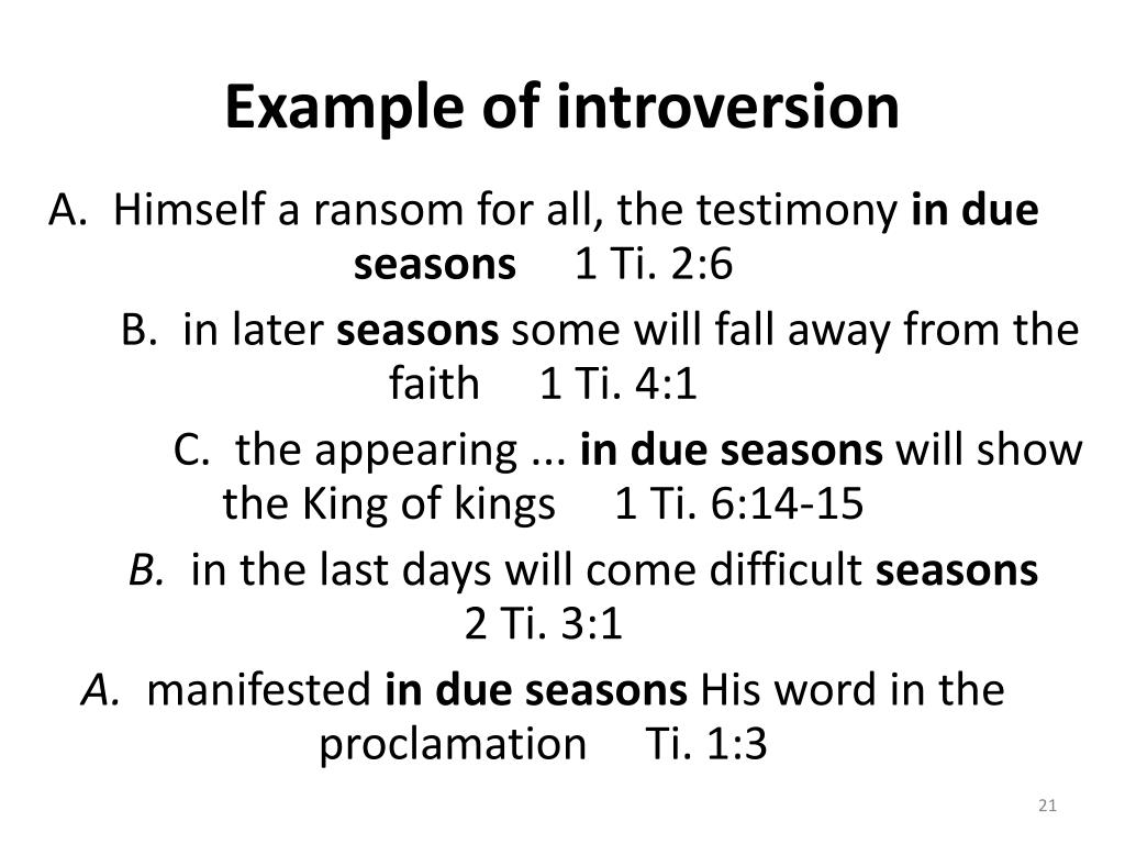 Example of introversion A. Himself a ransom for all, the testimony in due seasons 1 Ti. 2:6 B. in later seasons some will fall away from the faith 1 Ti. 4:1 C. the appearing ... in due seasons will show the King of kings 1 Ti. 6:14-15 B. in the last days will come difficult seasons 2 Ti. 3:1 A. manifested in due seasons His word in the proclamation Ti. 1:3