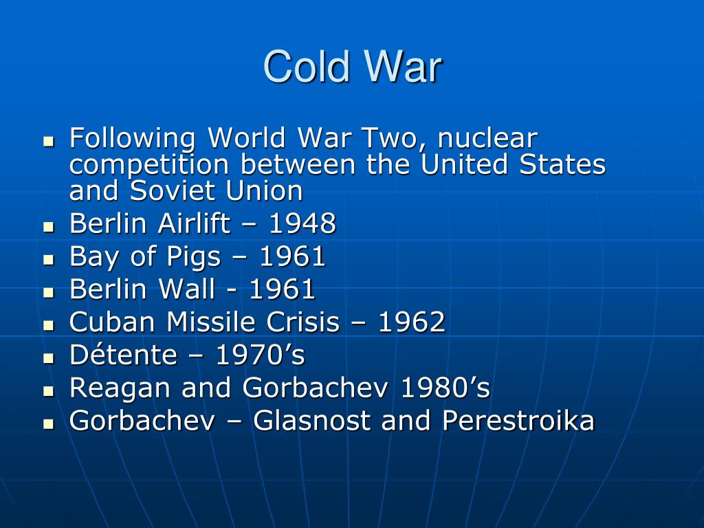Cold War • Following World War Two, nuclear competition between the United States and Soviet Union • Berlin Airlift – 1948 • Bay of Pigs – 1961 • Berlin Wall - 1961 • Cuban Missile Crisis – 1962 • Détente – 1970’s • Reagan and Gorbachev 1980’s • Gorbachev – Glasnost and Perestroika