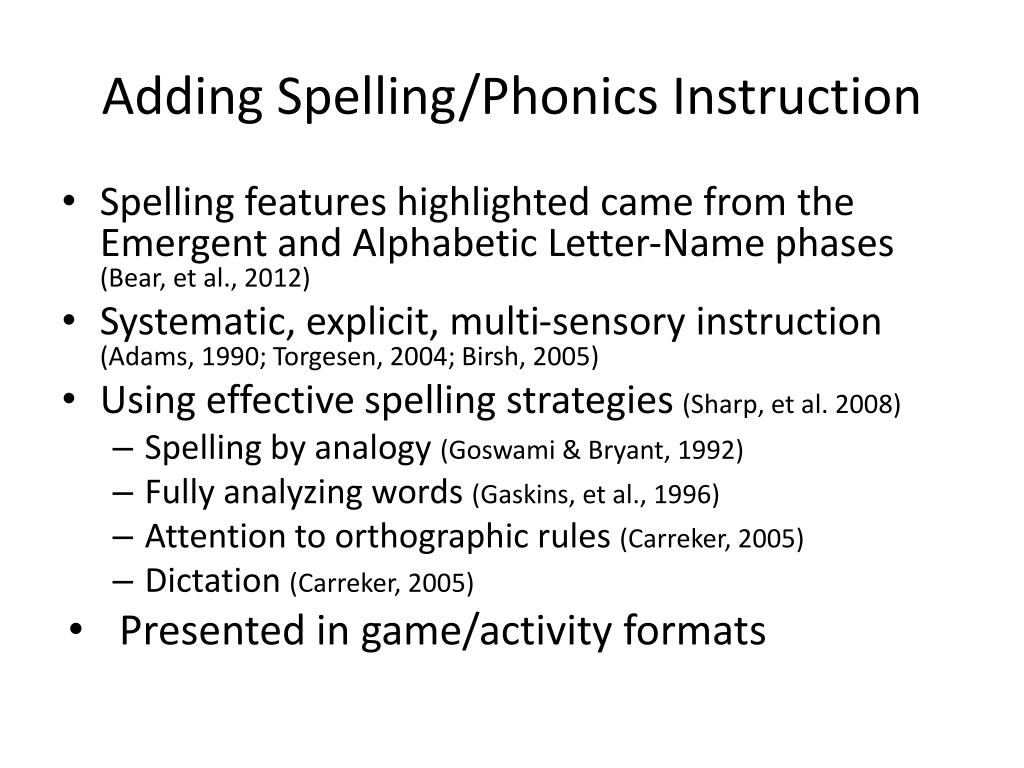 Adding Spelling/Phonics Instruction • Spelling features highlighted came from the Emergent and Alphabetic Letter-Name phases (Bear, et al., 2012) • Systematic, explicit, multi-sensory instruction (Adams, 1990; Torgesen, 2004; Birsh, 2005) • Using effective spelling strategies (Sharp, et al. 2008) • Spelling by analogy (Goswami & Bryant, 1992) • Fully analyzing words (Gaskins, et al., 1996) • Attention to orthographic rules (Carreker, 2005) • Dictation (Carreker, 2005) • Presented in game/activity formats
