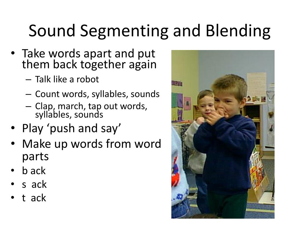 Sound Segmenting and Blending • Take words apart and put them back together again • Talk like a robot • Count words, syllables, sounds • Clap, march, tap out words, syllables, sounds • Play ‘push and say’ • Make up words from word parts • b ack • s ack • t ack