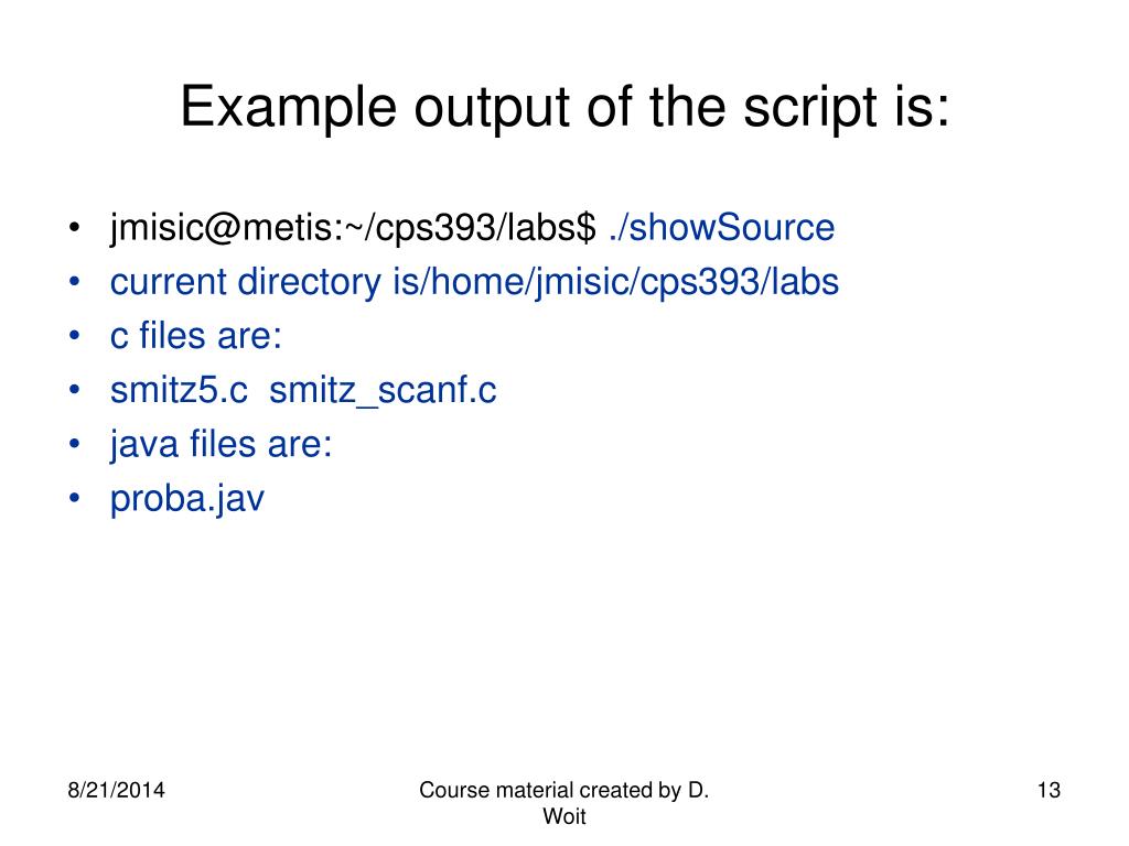 Example output of the script is: • jmisic@metis:~/cps393/labs$ ./showSource • current directory is/home/jmisic/cps393/labs • c files are: • smitz5.c smitz_scanf.c • java files are: • proba.jav Course material created by D. Woit