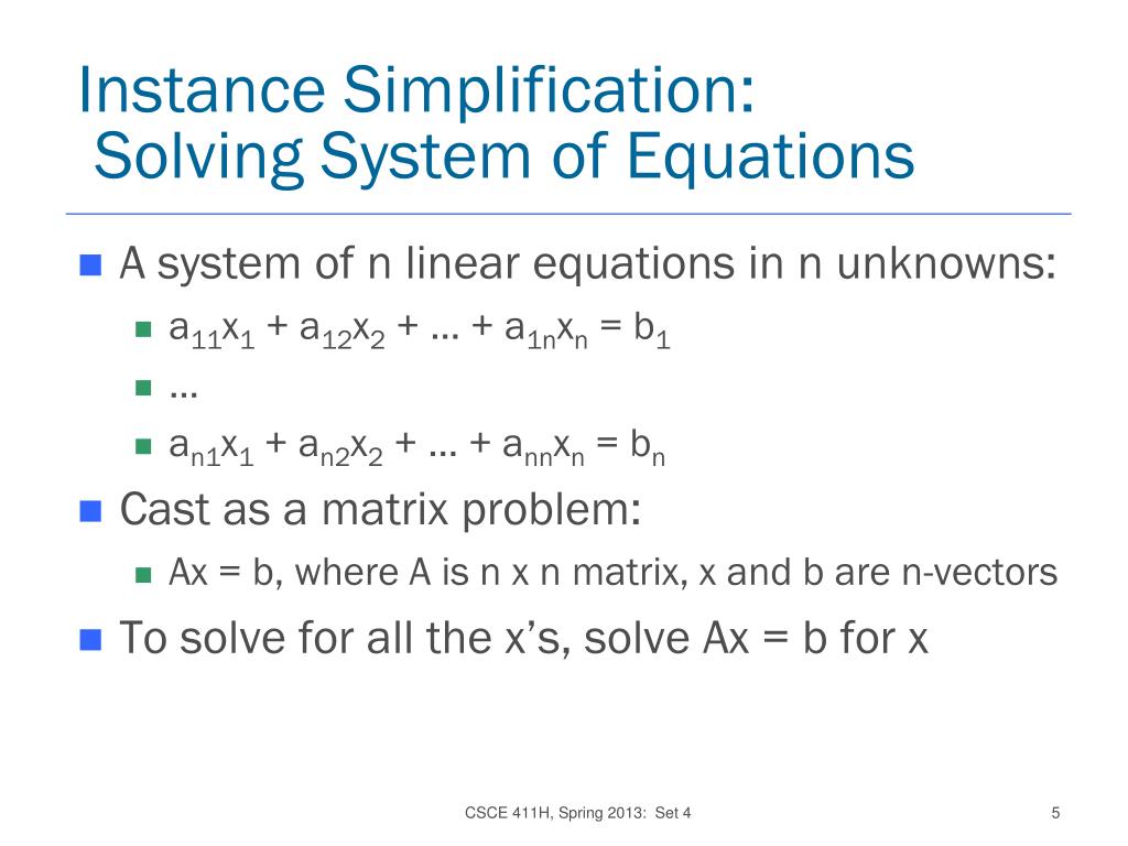 Instance Simplification: Solving System of Equations • A system of n linear equations in n unknowns: • a11x1 + a12x2 + … + a1nxn = b1 • … • an1x1 + an2x2 + … + annxn = bn • Cast as a matrix problem: • Ax = b, where A is n x n matrix, x and b are n-vectors • To solve for all the x’s, solve Ax = b for x CSCE 411H, Spring 2013: Set 4