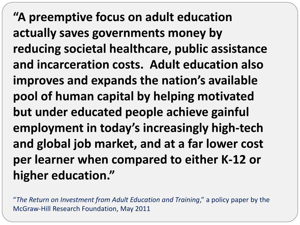 “A preemptive focus on adult education actually saves governments money by reducing societal healthcare, public assistance and incarceration costs. Adult education also improves and expands the nation’s available pool of human capital by helping motivated but under educated people achieve gainful employment in today’s increasingly high-tech and global job market, and at a far lower cost per learner when compared to either K-12 or higher education.” “The Return on Investment from Adult Education and Training,” a policy paper by the McGraw-Hill Research Foundation, May 2011