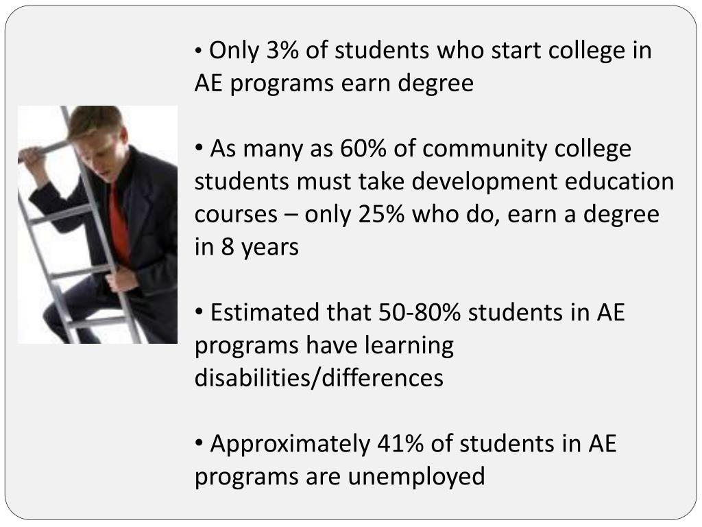 Only 3% of students who start college in AE programs earn degree • As many as 60% of community college students must take development education courses – only 25% who do, earn a degree in 8 years • Estimated that 50-80% students in AE programs have learning disabilities/differences • Approximately 41% of students in AE programs are unemployed