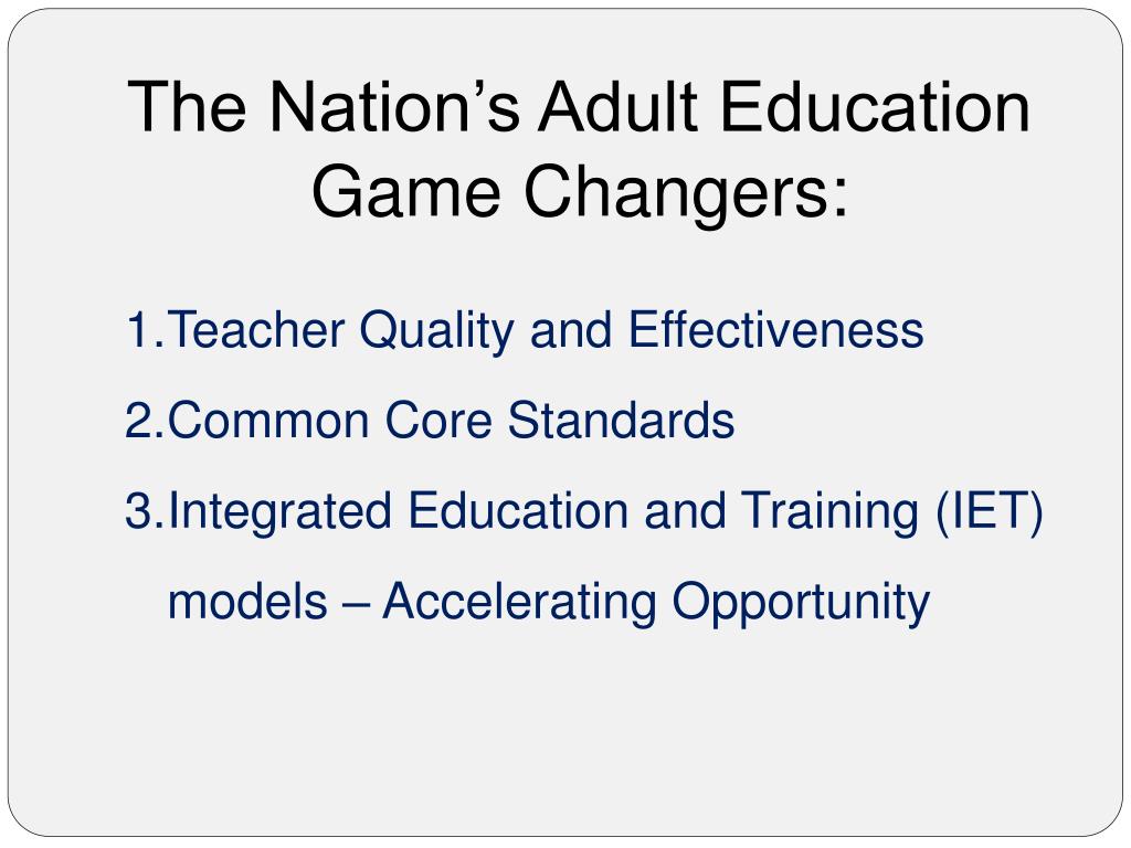 The Nation’s Adult Education Game Changers: Teacher Quality and Effectiveness Common Core Standards Integrated Education and Training (IET) models – Accelerating Opportunity