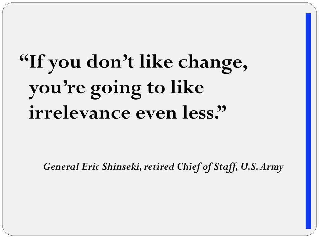 “If you don’t like change, you’re going to like irrelevance even less.” General Eric Shinseki, retired Chief of Staff, U.S. Army