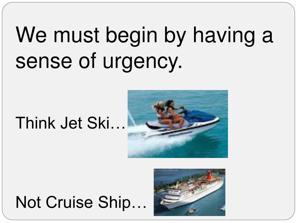 We must begin by having a sense of urgency. Think Jet Ski…. Not Cruise Ship…