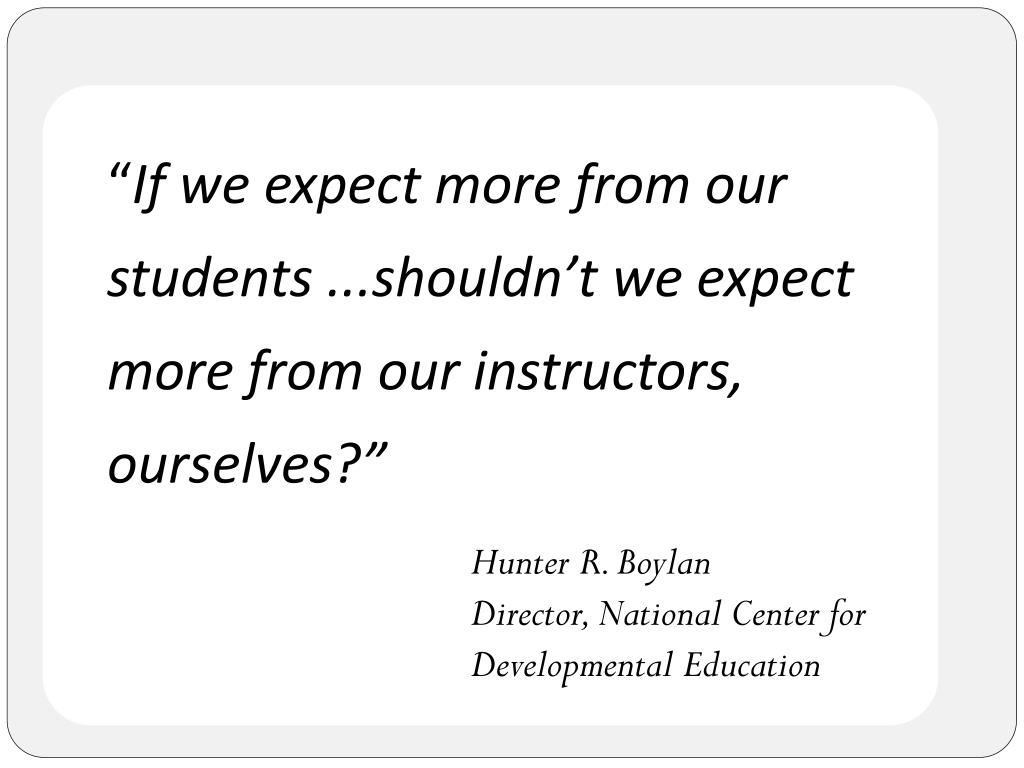 “If we expect more from our students ...shouldn’t we expect more from our instructors, ourselves?” Hunter R. Boylan Director, National Center for Developmental Education