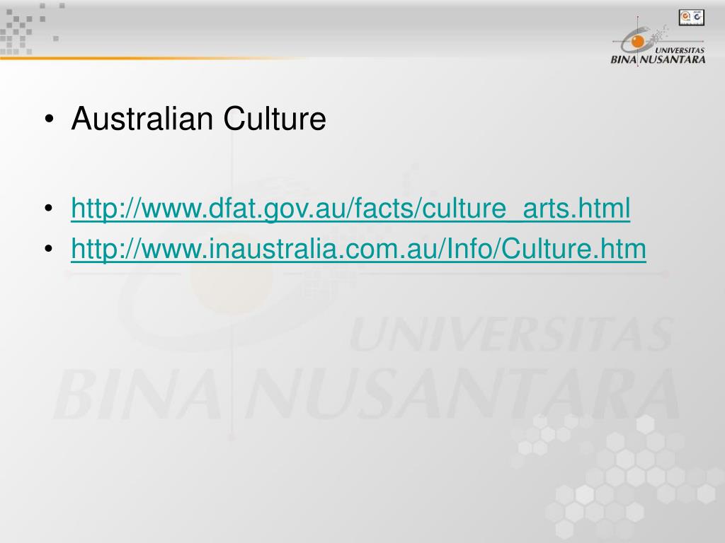 Australian Culture • http://www.dfat.gov.au/facts/culture_arts.html • http://www.inaustralia.com.au/Info/Culture.htm
