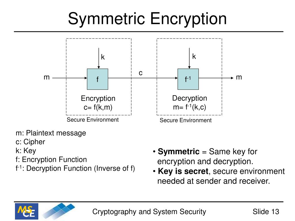 Symmetric Encryption Different kinds of symmetric encryption schemes: • Characterwise with a key.<Output char.> = f (k,<Input char.>) • Blockwise with a key.<Output block> = f (k,<Input block>) • Symbolwise/bitwise with sequence of keysk: k1,k2,k3,… • Blockwise with block chaining.