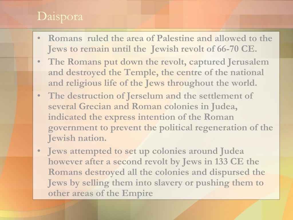 Daispora • Romans ruled the area of Palestine and allowed to the Jews to remain until the Jewish revolt of 66-70 CE. • The Romans put down the revolt, captured Jerusalem and destroyed the Temple, the centre of the national and religious life of the Jews throughout the world. • The destruction of Jerselum and the settlement of several Grecian and Roman colonies in Judea, indicated the express intention of the Roman government to prevent the political regeneration of the Jewish nation. • Jews attempted to set up colonies around Judea however after a second revolt by Jews in 133 CE the Romans destroyed all the colonies and dispursed the Jews by selling them into slavery or pushing them to other areas of the Empire