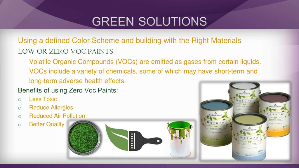 GREEN SOLUTIONS Using a defined Color Scheme and building with the Right Materials LOW OR ZERO VOC PAINTS Volatile Organic Compounds (VOCs) are emitted as gases from certain liquids. VOCs include a variety of chemicals, some of which may have short-term and long-term adverse health effects. Benefits of using Zero Voc Paints: • Less Toxic • Reduce Allergies • Reduced Air Pollution • Better Quality