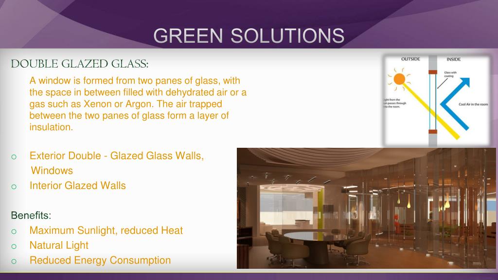 GREEN SOLUTIONS DOUBLE GLAZED GLASS: A window is formed from two panes of glass, with the space in between filled with dehydrated air or a gas such as Xenon or Argon. The air trapped between the two panes of glass form a layer of insulation. • Exterior Double - Glazed Glass Walls, Windows • Interior Glazed Walls Benefits: • Maximum Sunlight, reduced Heat • Natural Light • Reduced Energy Consumption