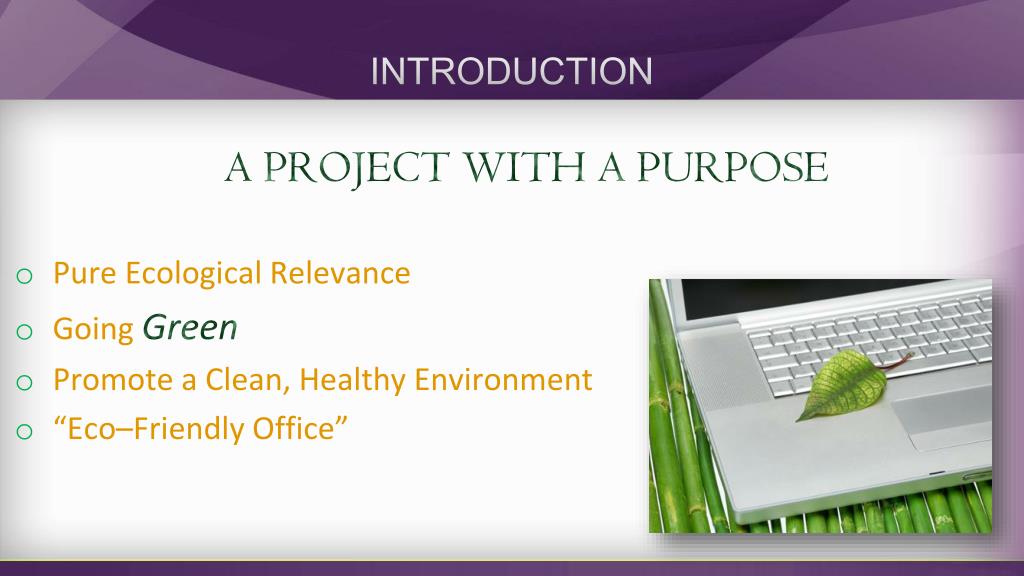 INTRODUCTION A PROJECT WITH A PURPOSE • Pure Ecological Relevance • Going Green • Promote a Clean, Healthy Environment • “Eco–Friendly Office”