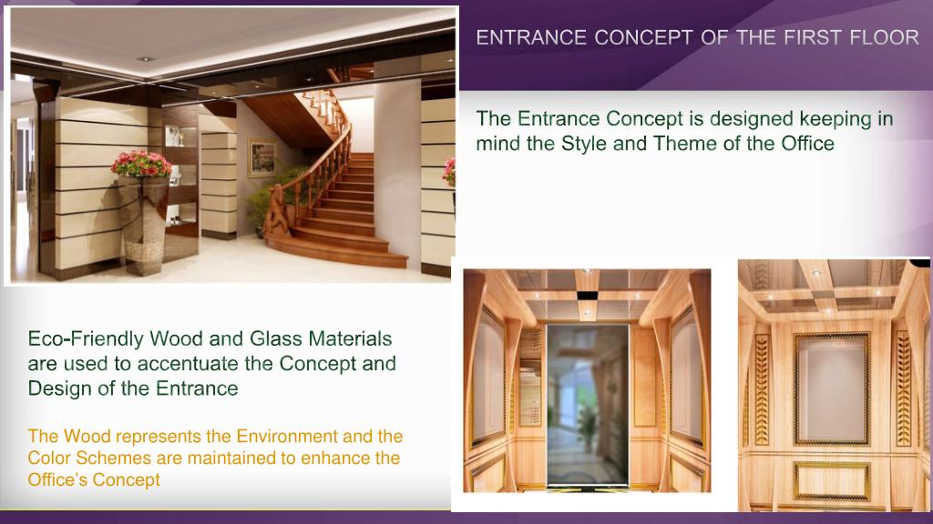 ENTRANCE CONCEPT OF THE FIRST FLOOR The Entrance Concept is designed keeping in mind the Style and Theme of the Office Eco-Friendly Wood and Glass Materials are used to accentuate the Concept and Design of the Entrance The Wood represents the Environment and the Color Schemes are maintained to enhance the Office’s Concept