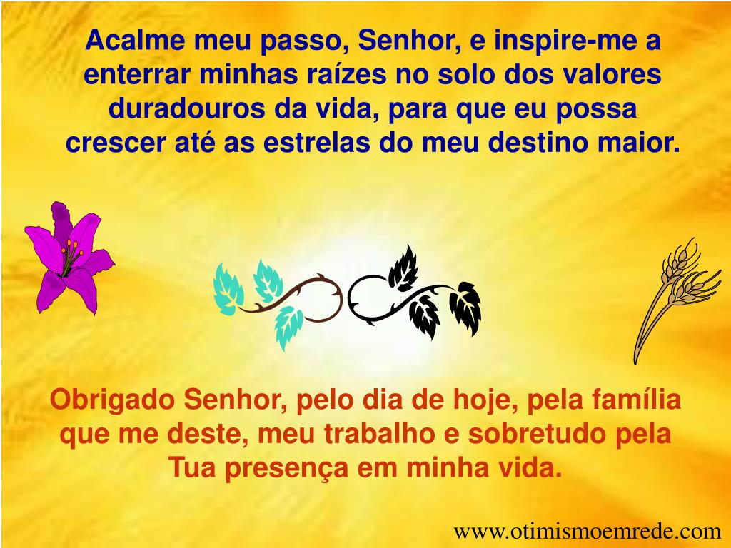 Acalme meu passo, Senhor, e inspire-me a enterrar minhas raízes no solo dos valores duradouros da vida, para que eu possa crescer até as estrelas do meu destino maior. Obrigado Senhor, pelo dia de hoje, pela família que me deste, meu trabalho e sobretudo pela Tua presença em minha vida. www.otimismoemrede.com
