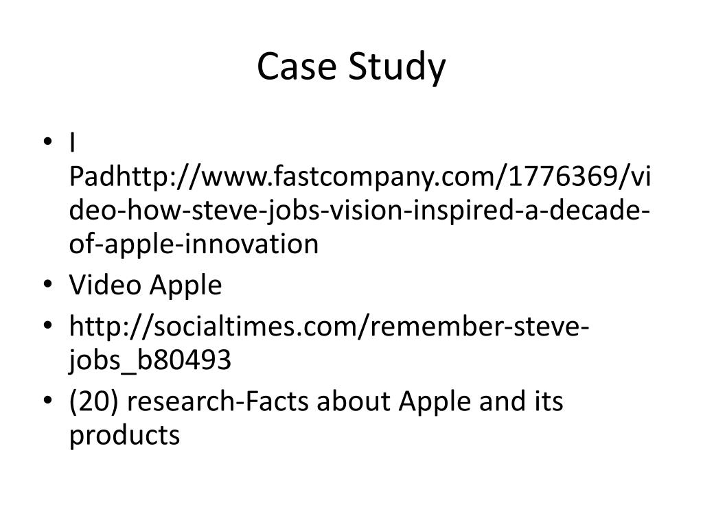 Case Study • I Padhttp://www.fastcompany.com/1776369/video-how-steve-jobs-vision-inspired-a-decade-of-apple-innovation • Video Apple • http://socialtimes.com/remember-steve-jobs_b80493 • (20) research-Facts about Apple and its products