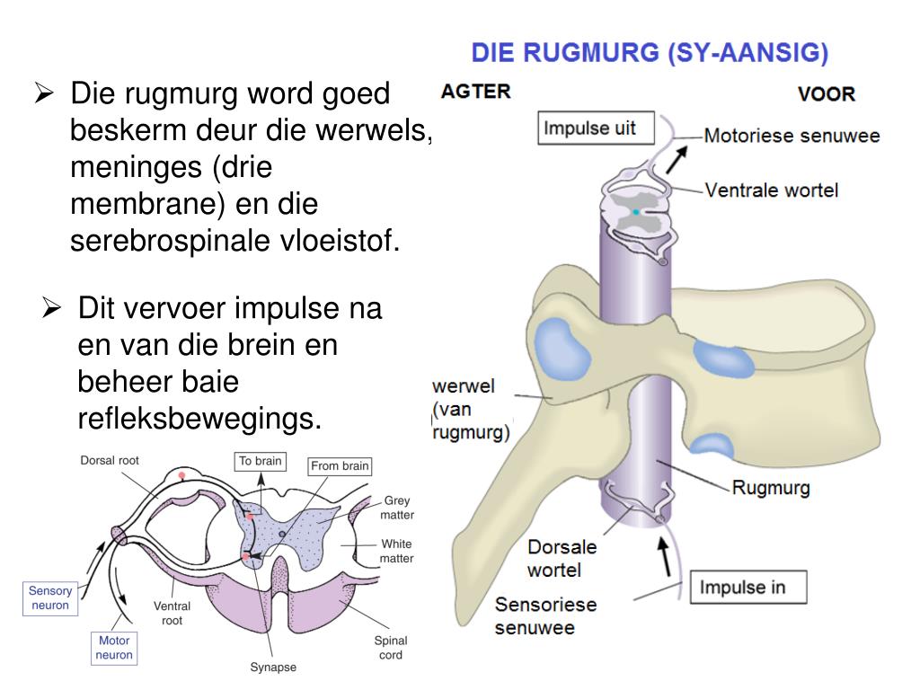 Die rugmurg word goedbeskermdeur die werwels, meninges(drie membrane) en die serebrospinalevloeistof. • Ditvervoer impulse na en van die breinen beheerbaierefleksbewegings.