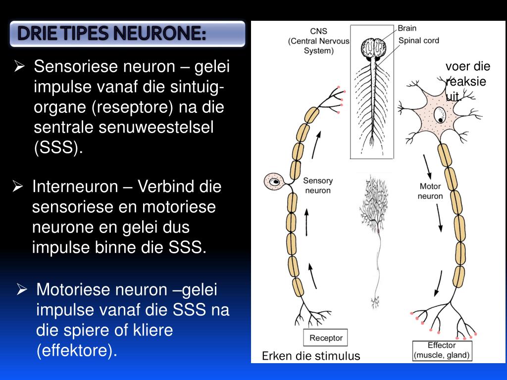 Sensorieseneuron – geleiimpulse vanaf die sintuig-organe (reseptore) na die sentralesenuweestelsel (SSS). voer die reaksieuit. • Interneuron– Verbind die sensoriese en motoriese neurone en geleidus impulse binne die SSS. • Motorieseneuron –gelei impulse vanaf die SSS na die spiere of kliere (effektore). Erken die stimulus