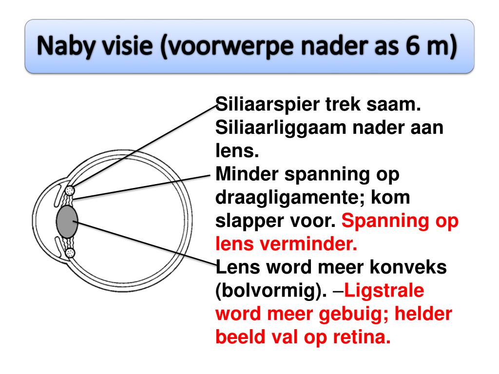 Siliaarspier trek saam. Siliaarliggaamnaderaan lens. Minder spanning op draagligamente; kom slapper voor. Spanning op lens verminder. Lens word meerkonveks (bolvormig). –Ligstrale word meergebuig; helderbeeldval op retina.