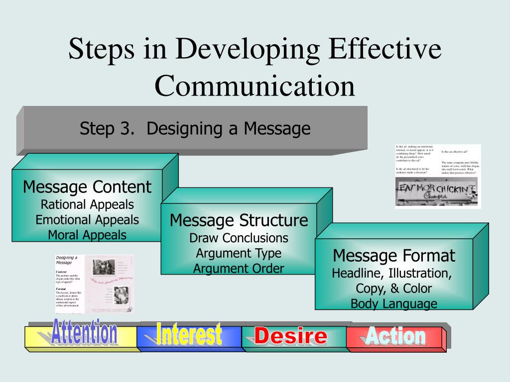 Step 3. Designing a Message Attention Interest Desire Action Steps in Developing Effective Communication Message Content Rational Appeals Emotional Appeals Moral Appeals Message Structure Draw Conclusions Argument Type Argument Order Message Format Headline, Illustration, Copy, & Color Body Language