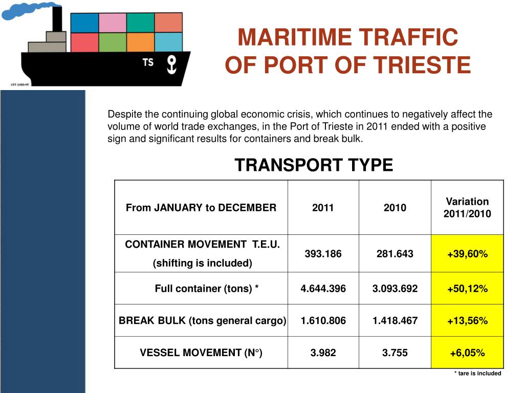 MARITIME TRAFFIC OF PORT OF TRIESTE Despite the continuing global economic crisis, which continues to negatively affect the volume of world trade exchanges, in the Port of Trieste in 2011 ended with a positive sign and significant results for containers and break bulk. TRANSPORT TYPE