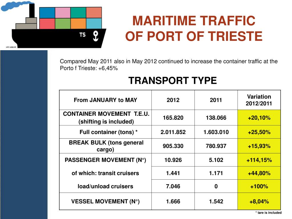 MARITIME TRAFFIC OF PORT OF TRIESTE Compared May 2011 also in May 2012 continued to increase the container traffic at the Porto f Trieste: +6,45% TRANSPORT TYPE
