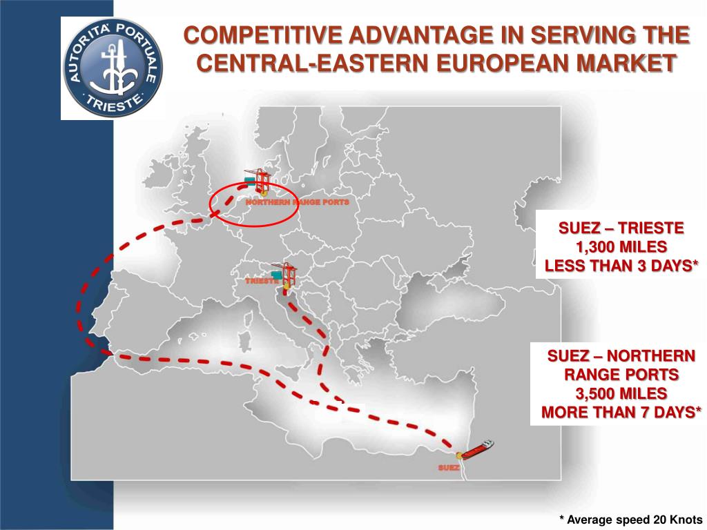 COMPETITIVE ADVANTAGE IN SERVING THE CENTRAL-EASTERN EUROPEAN MARKET SUEZ – TRIESTE 1,300 MILES LESS THAN 3 DAYS* SUEZ – NORTHERN RANGE PORTS 3,500 MILES MORE THAN 7 DAYS* * Averagespeed 20 Knots