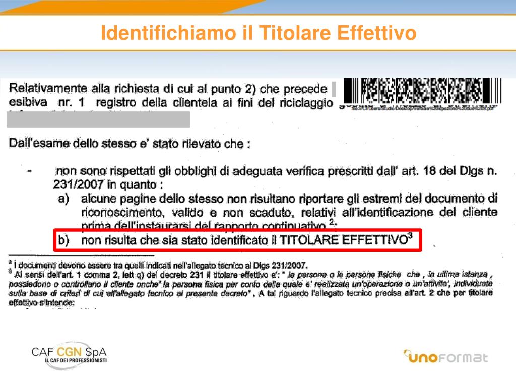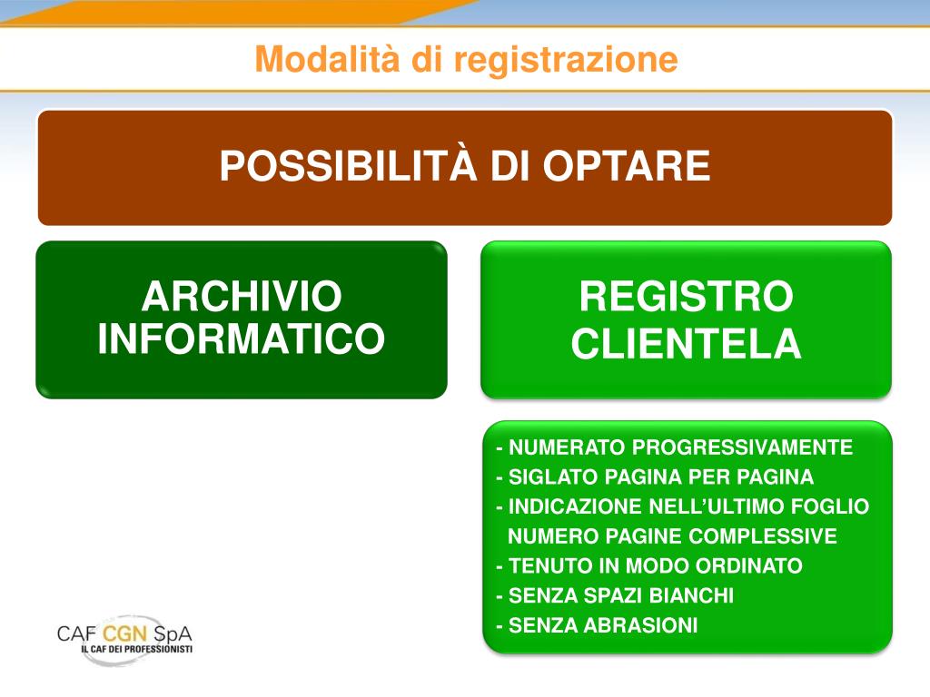 Contenuto fascicolo • fotocopia documento di riconoscimento valido alla data dell’identificazione • fotocopia codice fiscale • fotocopia partita IVA • visura camerale (consigliato per le ditte individuali, obbligatorio per i soggetti diversi da persona fisica per verificare il soggetto o i soggetti che hanno il potere di rappresentanza. Verbale CdA di nomina) • documentazione in base alla quale si è verificata la possibilità di applicare obblighi semplificati di adeguata verifica o, al contrario, la necessità di ricorrere alla procedura rafforzata • eventuale attestazione ex art. 30 • copia del mandato professionale • documentazione richiesta dal professionista per individuare il titolare effettivo • dichiarazione da parte del cliente sullo scopo e sull’oggetto dell’attività o dell’operazione per la quale è richiesta la prestazione professionale • eventuale ulteriore documentazione richiesta dal professionista per individuare il titolare effettivo COSTANTEMENTE AGGIORNATO PRESENTATO SU RICHIESTA ORGANI DI CONTROLLO PROTETTO CON MISURE PRIVACY