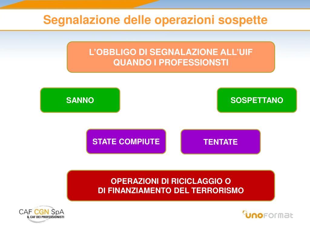 Segnalazione delle operazioni sospette L’OBBLIGO DI SEGNALAZIONE ALL’UIFQUANDO I PROFESSIONSTI SANNO SOSPETTANO STATE COMPIUTE TENTATE OPERAZIONI DI RICICLAGGIO O DI FINANZIAMENTO DEL TERRORISMO