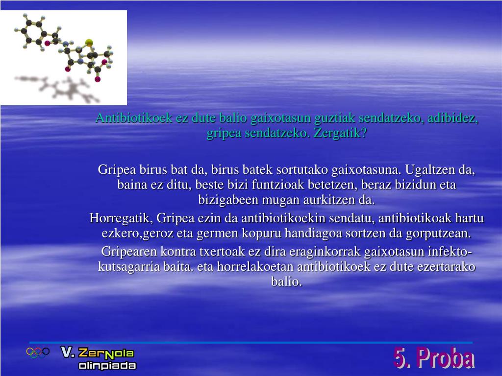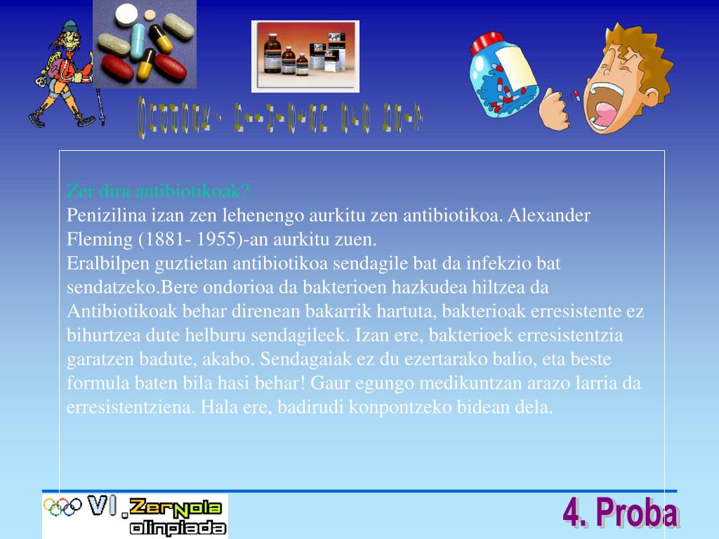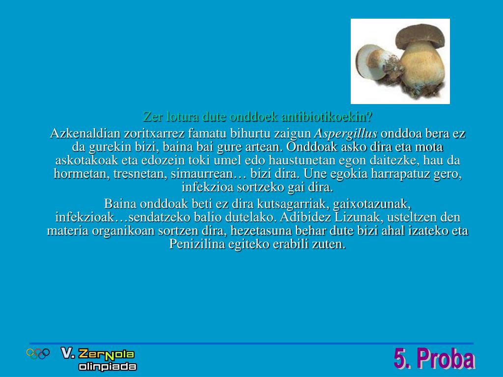 Onddoak, piluletan ere bai? Zer dira antibiotikoak? Penizilina izan zen lehenengo aurkitu zen antibiotikoa. Alexander Fleming (1881- 1955)-an aurkitu zuen. Eralbilpen guztietan antibiotikoa sendagile bat da infekzio bat sendatzeko.Bere ondorioa da bakterioen hazkudea hiltzea da Antibiotikoak behar direnean bakarrik hartuta, bakterioak erresistente ez bihurtzea dute helburu sendagileek. Izan ere, bakterioek erresistentzia garatzen badute, akabo. Sendagaiak ez du ezertarako balio, eta beste formula baten bila hasi behar! Gaur egungo medikuntzan arazo larria da erresistentziena. Hala ere, badirudi konpontzeko bidean dela.